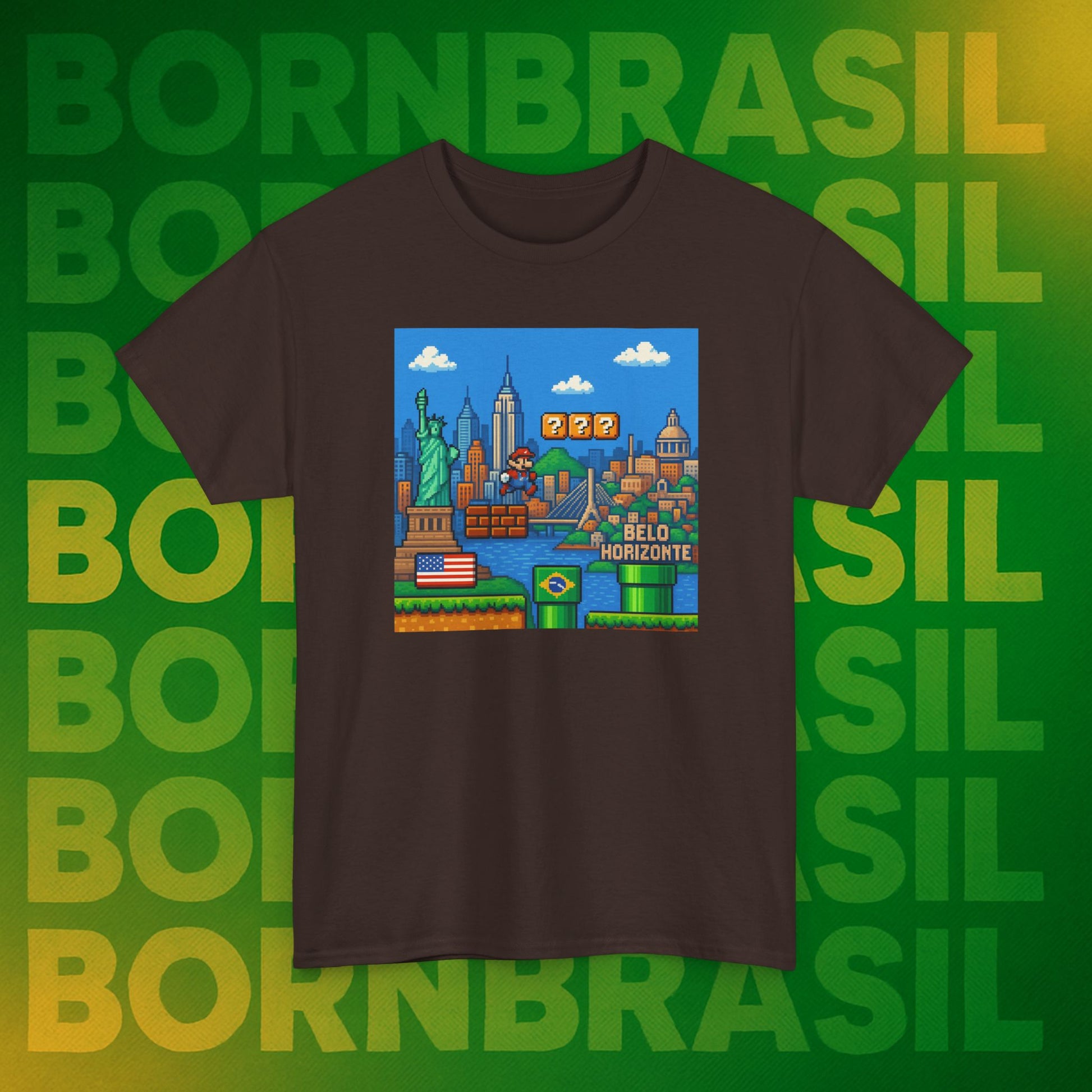 A camiseta Masculina Born Brasil De Volta Pro Brasil é uma homenagem aos brasileiros que vivem fora, mas sentem no coração a vontade de retornar às suas raízes. Inspirada na estética retrô dos games 16-bit, a estampa mostra um personagem pulando do cenário dos EUA para o Brasil, entre arranha-céus de Nova York e o Cristo Redentor no Rio de Janeiro. Com blocos de interrogação que remetem a fases da vida, o design traduz de forma divertida e nostálgica a jornada de tantos brasileiros. Produzida em malha premium, essa camiseta brasileira conecta orgulho, humor e identidade cultural. Perfeita para quem vive nos EUA, está pensando em retornar ou quer carregar o Brasil sempre no peito.