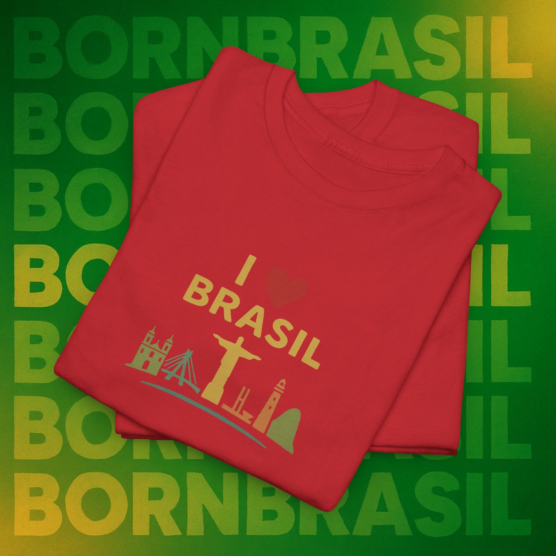 camiseta brasileira, moda brasileira, orgulho cultural, estampa Brasil, camiseta com coração, born brasil, skyline brasileiro.