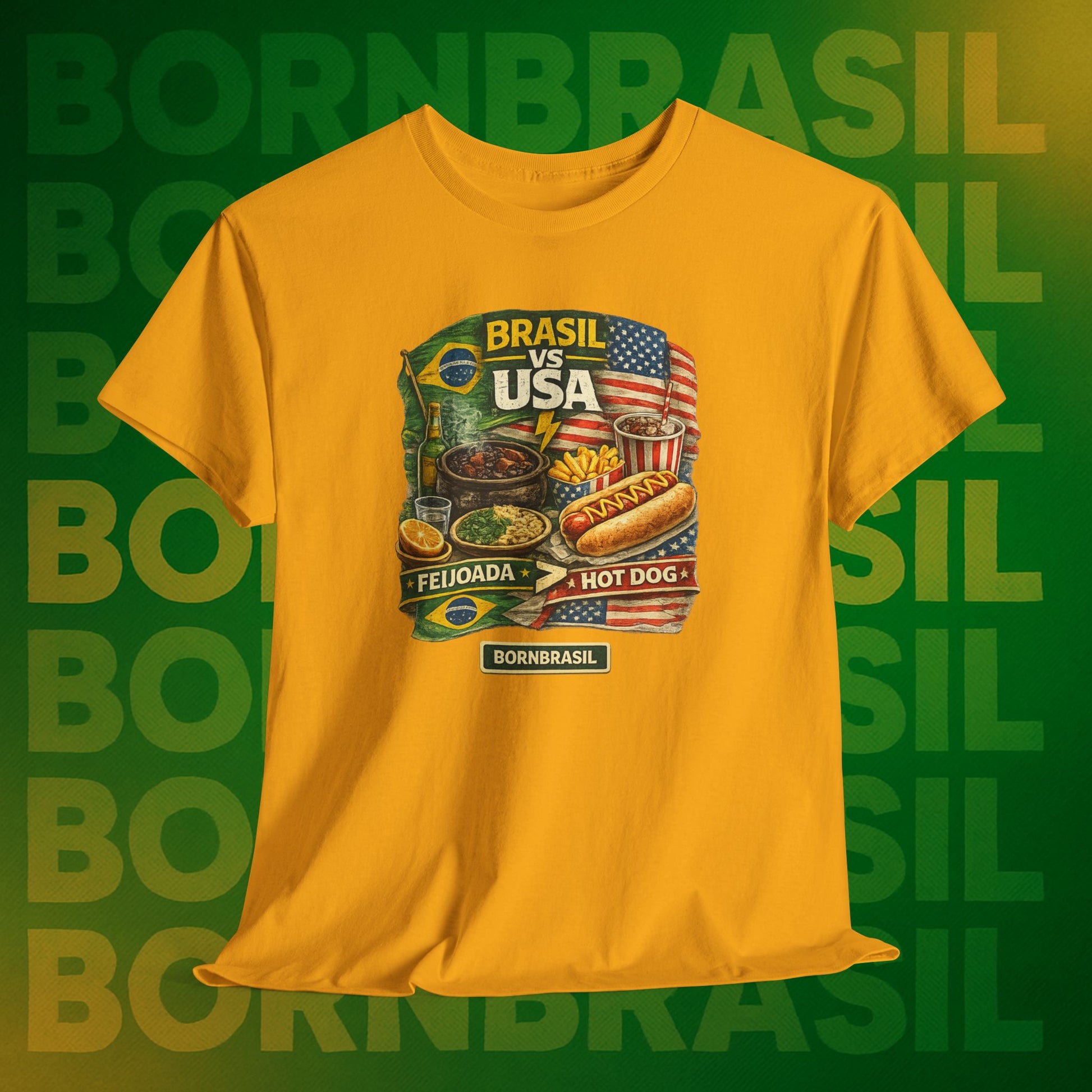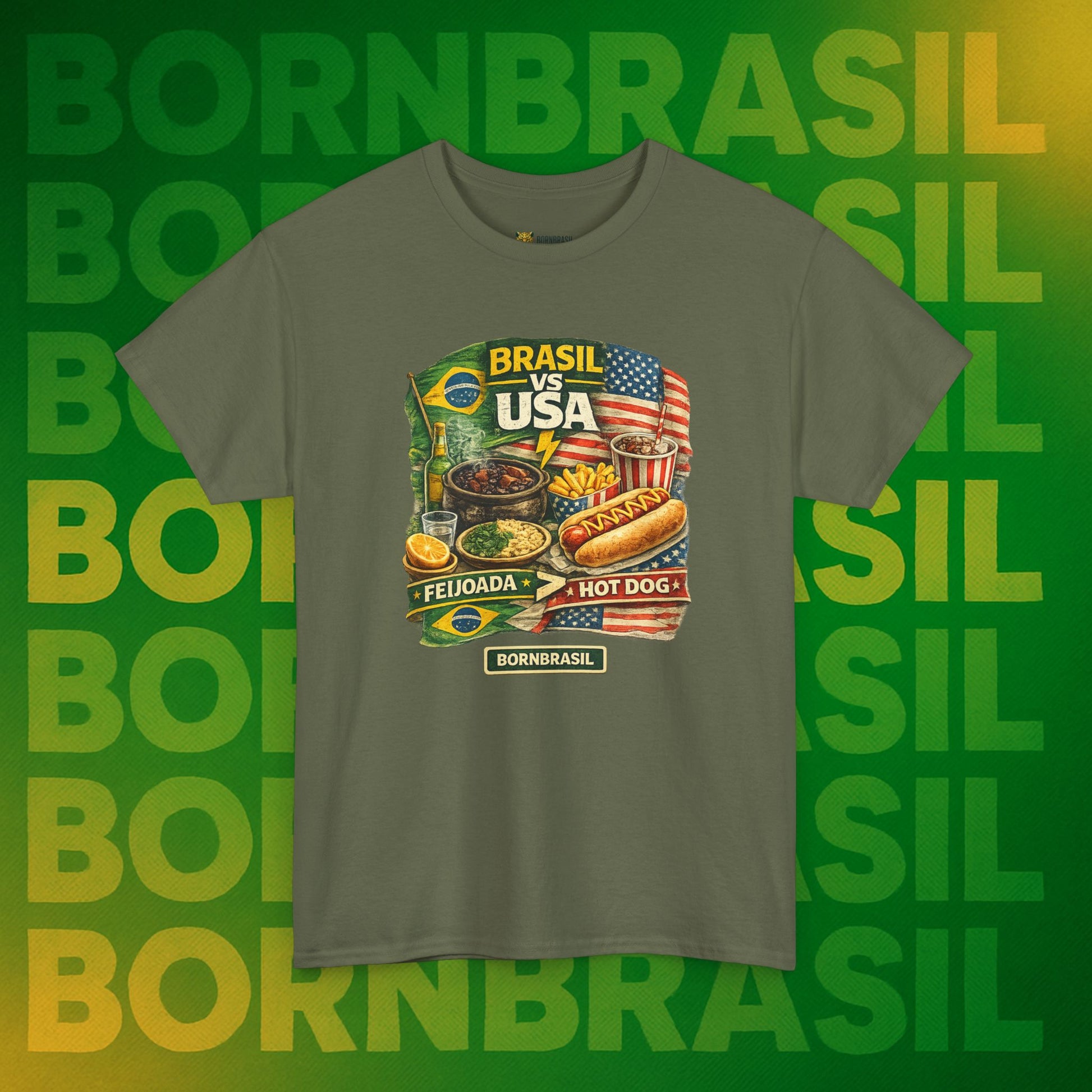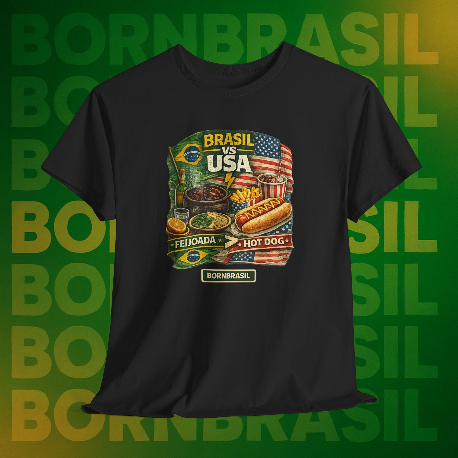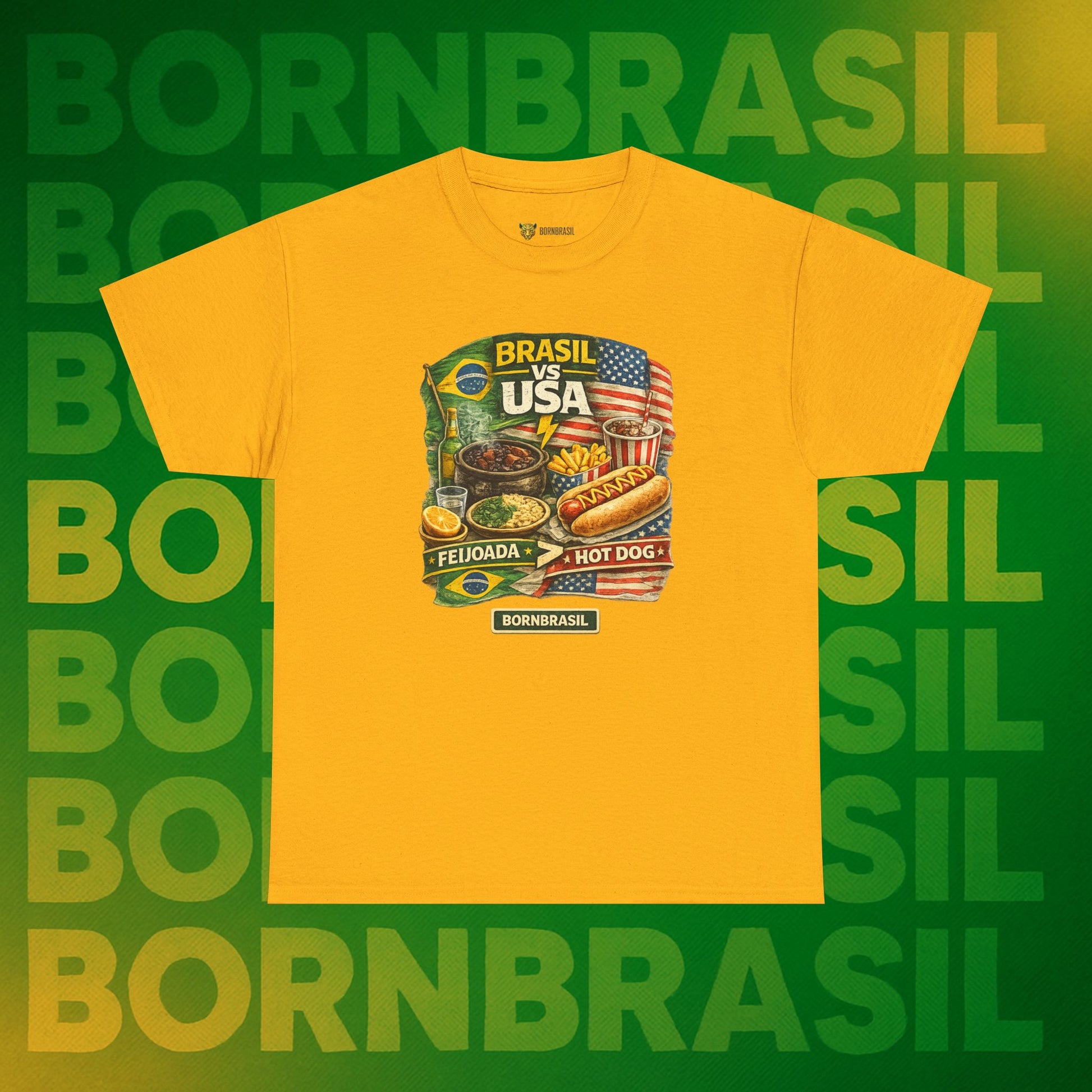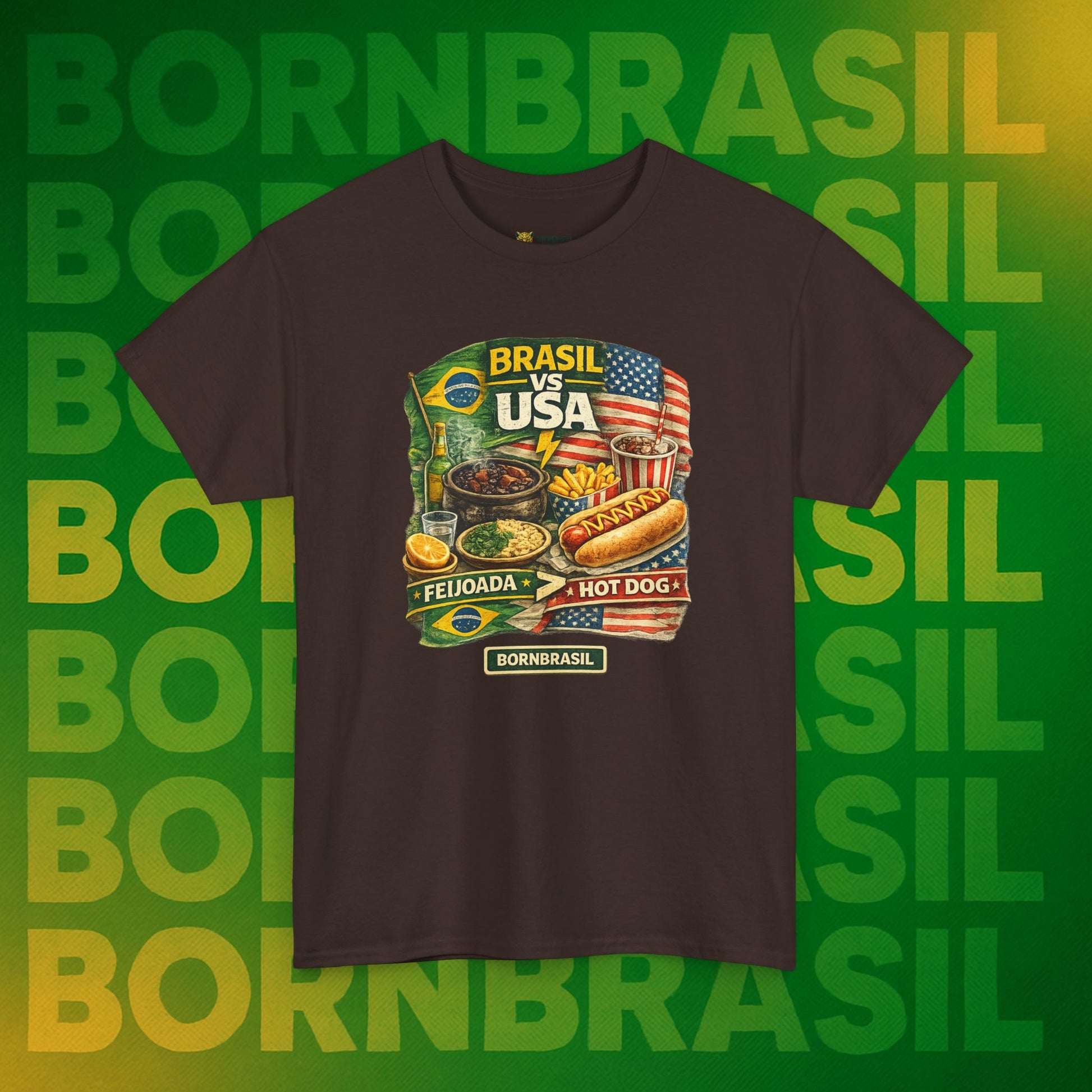 Viver fora é aprender a conviver com o hot dog, mas o coração (e o estômago) sempre baterá mais forte por uma feijoada completa. Esta estampa é para quem sabe que a nossa "comida de alma" ganha qualquer disputa gastronômica no mundo. Um toque de ironia saudável para o seu dia a dia, mostrando que o seu paladar continua sendo 100% verde e amarelo.