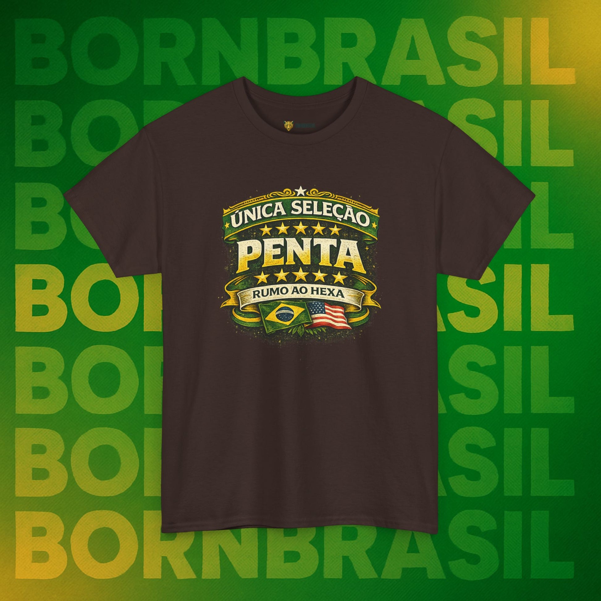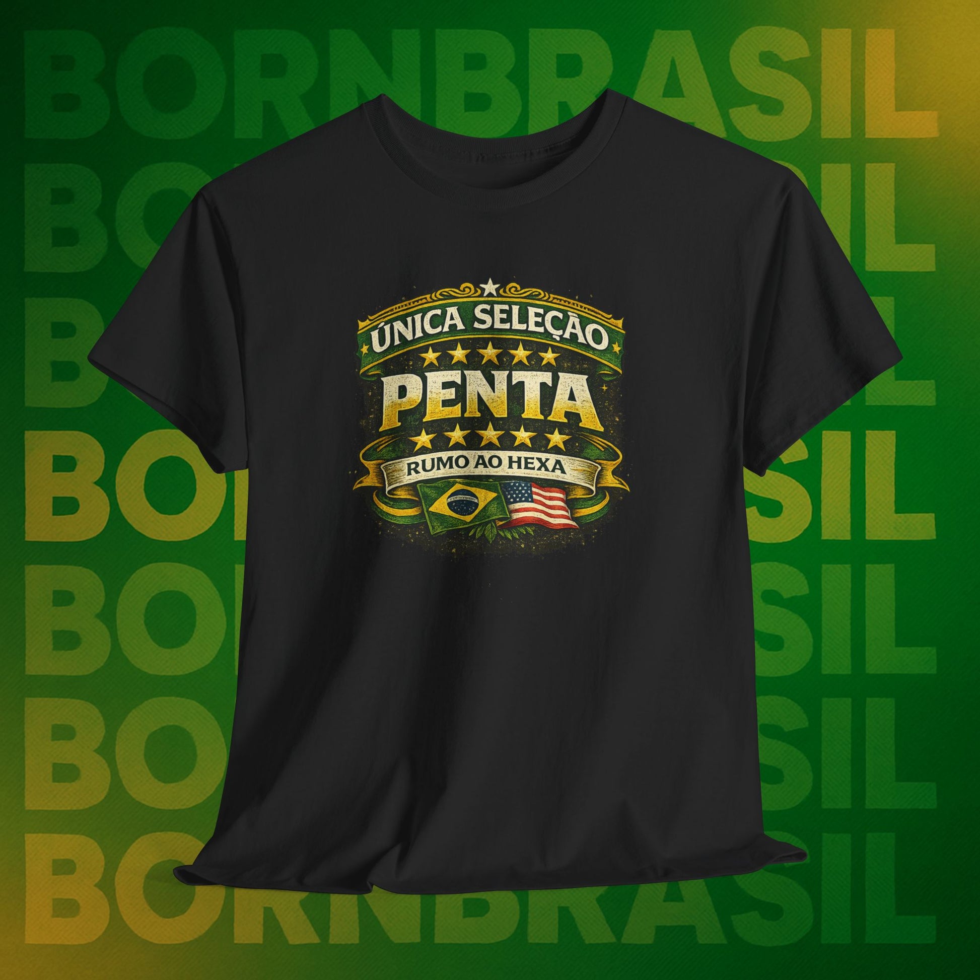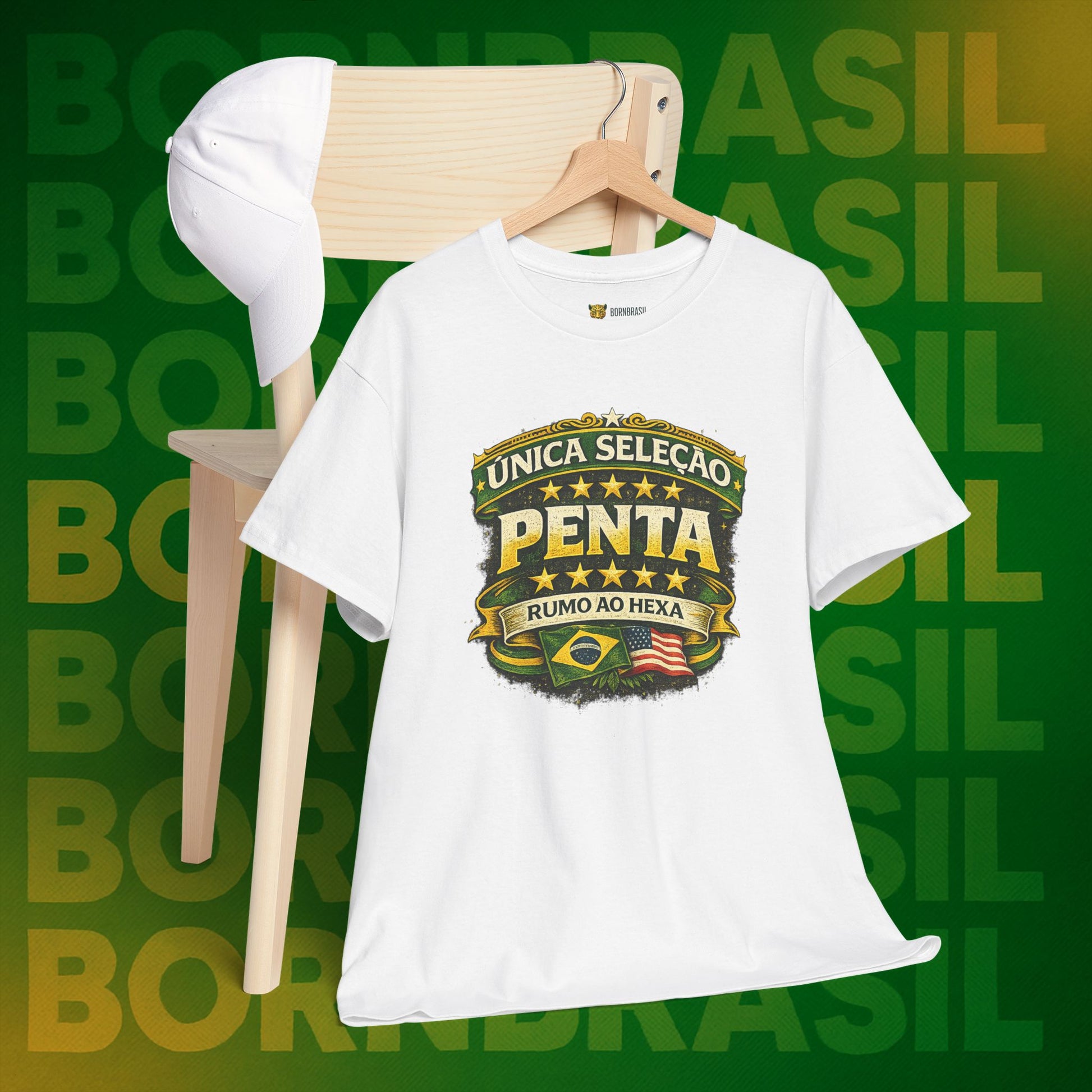 Pode mudar o endereço, o idioma e a rotina, mas a paixão pelas cinco estrelas é imutável. Esta camiseta da BornBrasil é para o brasileiro que sabe o valor da nossa história. Unindo o orgulho de ser a única seleção Pentacampeã com a garra de quem vive o "corre" no exterior, essa peça é o seu uniforme oficial de identidade.